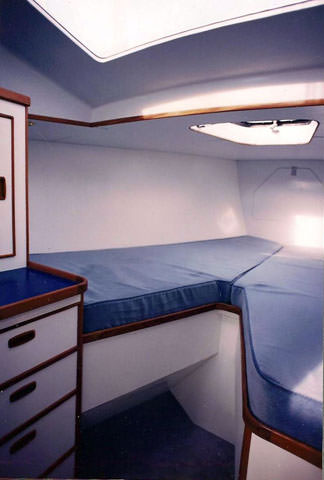 Clean white interior with teak trim, very comprehensive nav-station and galley.