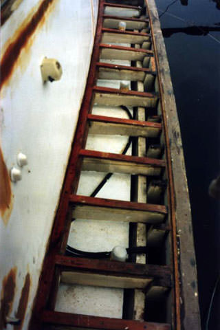 - The heavy timber rubbing strake on lower decks secured by long bronze coach screws, enter a join between plywood and the tops of frames cause delaminating